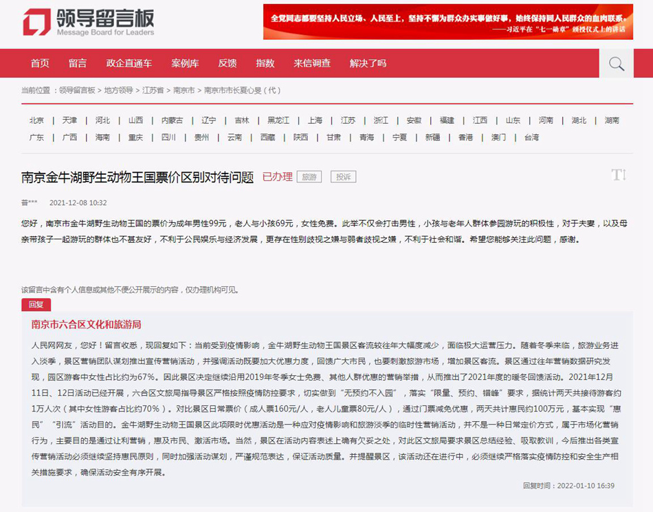 2021年12月8日,網(wǎng)友在人民網(wǎng)“領(lǐng)導(dǎo)留言板”向南京市市長留言稱,南京市金牛湖野生動物王國的票價為成年男性99元,老人與小孩69元,女性免費。此舉不僅打擊男性、小孩與老年人參園游玩的積極性,而且對于夫妻以及母親帶孩子一起游玩的群體也不甚友好,不利于公民娛樂與經(jīng)濟發(fā)展,另外更存在性別歧視與弱者歧視之嫌,不利于社會和諧。
