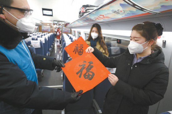 昨天5時(shí)34分,北京地區(qū)首趟春運(yùn)高鐵G6737次列車發(fā)車,列車員將精心準(zhǔn)備的福字送給旅客。本報(bào)記者 安旭東攝
