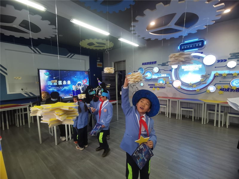 為進一步減輕學(xué)生的課業(yè)負(fù)擔(dān),更好地促進學(xué)生們的全面發(fā)展,該校變“常規(guī)考試”為“學(xué)科素養(yǎng)考核”,學(xué)業(yè)評價借助“天宮之旅”項目式研學(xué)的形式進行,圍繞語文、數(shù)學(xué)、英語、體育、音樂、科學(xué)、美術(shù)七門學(xué)科,分一、二年級設(shè)置了“天宮生活艙”“探索星未來”“星球?qū)ε觥薄疤占佑驼尽钡取瓣P(guān)卡”,學(xué)生們通過“闖關(guān)”既鞏固了知識,又提高了學(xué)習(xí)興趣。