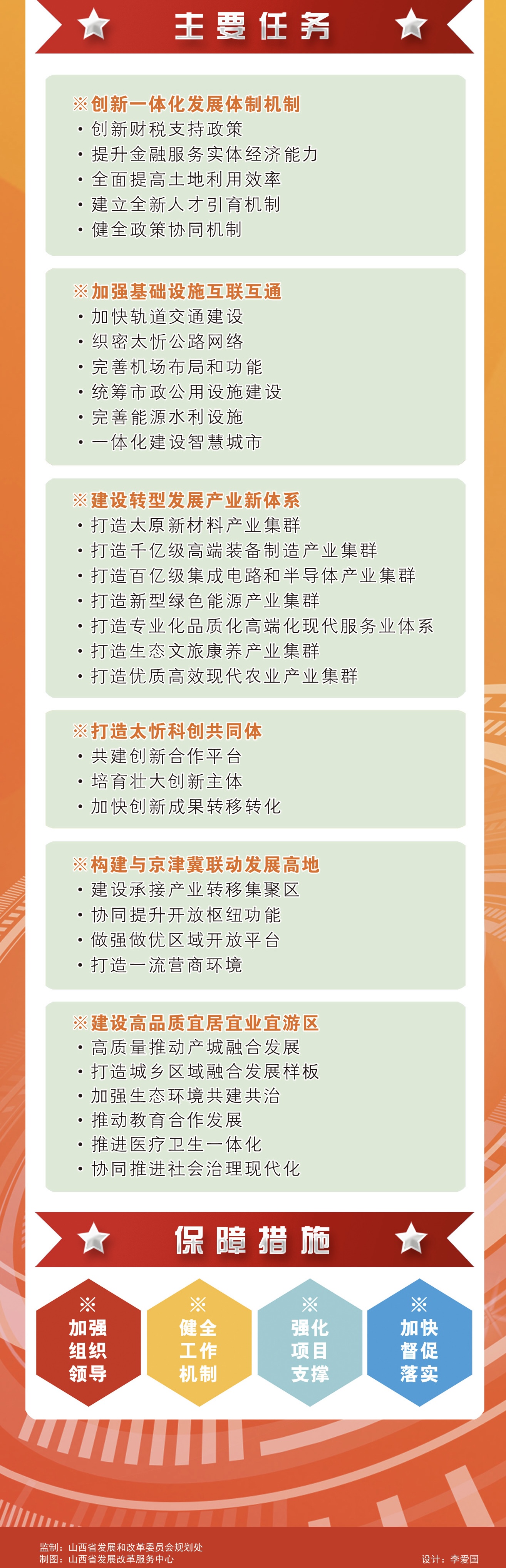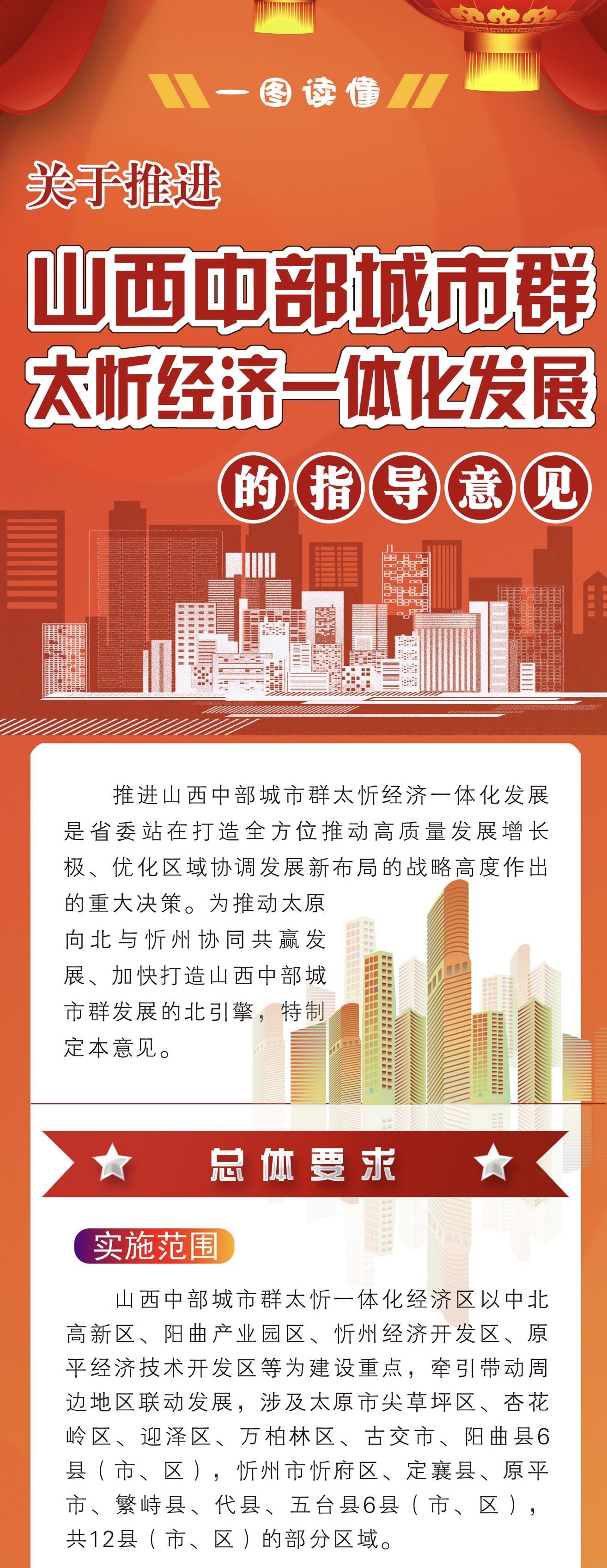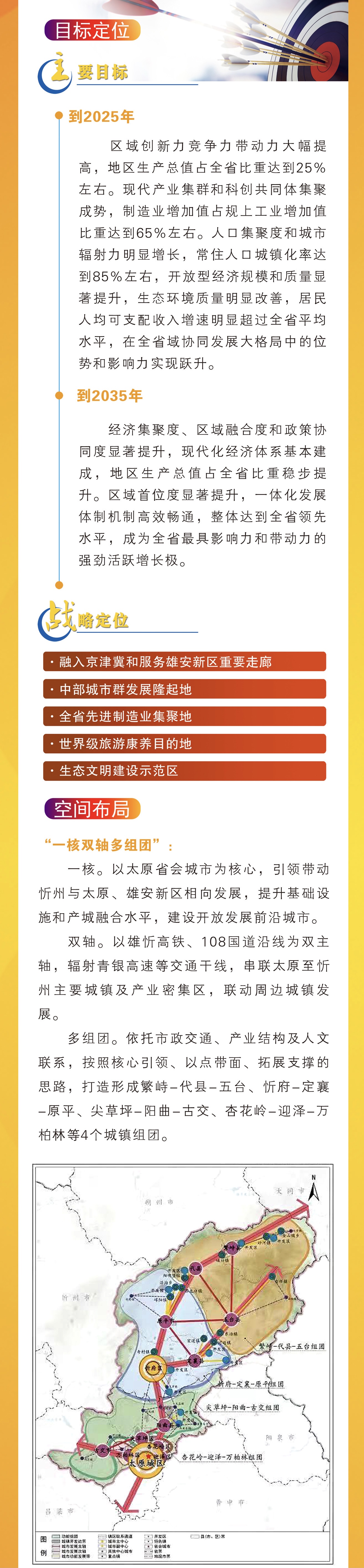 《指導(dǎo)意見》謀劃確定了太忻一體化經(jīng)濟(jì)區(qū)的實(shí)施范圍,提出了融入京津冀和服務(wù)雄安新區(qū)重要走廊、中部城市群發(fā)展隆起地、全省先進(jìn)制造業(yè)集聚地、世界級(jí)旅游康養(yǎng)目的地、生態(tài)文明建設(shè)示范區(qū)等五大戰(zhàn)略定位和“一軸雙核多組團(tuán)”的空間布局,分2025年、2035年兩個(gè)時(shí)間節(jié)點(diǎn)明確了發(fā)展目標(biāo),部署了六個(gè)方面的重點(diǎn)任務(wù)。