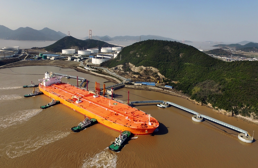 30萬(wàn)噸巨型油輪靠泊岙山石油轉(zhuǎn)運(yùn)基地。中國(guó)(浙江)自由貿(mào)易試驗(yàn)區(qū)舟山管理委員會(huì)供圖
