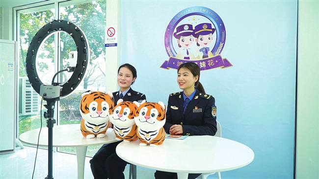湖州市安吉縣綜合行政執(zhí)法局與安吉縣公安局近日聯(lián)合建立“城警姐妹花”品牌,以直播的形式開展普法宣傳活動。(潘瑞安、王豆豆)