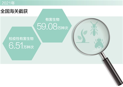 據(jù)統(tǒng)計(jì),2021年,全國(guó)海關(guān)截獲有害生物59.08萬(wàn)種次、檢疫性有害生物6.51萬(wàn)種次,首次檢出致死粒線蟲(chóng)、鈴蘭短體線蟲(chóng)、北美齒小蠹等危險(xiǎn)性有害生物,有效防止紅火蟻、高致病性禽流感等重大動(dòng)植物疫情疫病傳入,退回、銷毀不合格農(nóng)產(chǎn)品584批。
