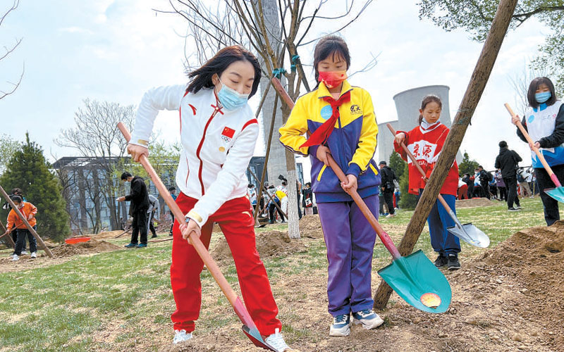 冬奧冠軍隋文靜與石景山的青少年一起參與植樹活動。 本報記者 吳鏑攝