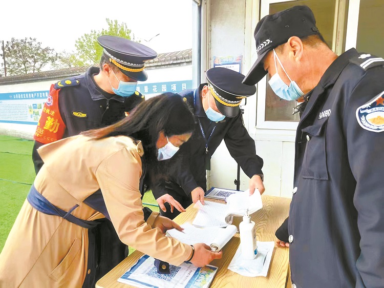 馮向軍(右二)查看施工單位疫情防控臺(tái)賬。