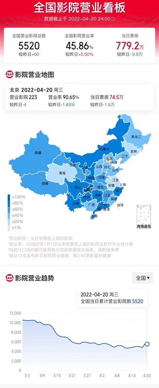 據國內某專業(yè)電影數(shù)據平臺,4月20日全國影院營業(yè)率45.86%,營業(yè)影院5520家,較上日增加60家,大盤票房779.2萬元。截至4月20日23時,浙江省單日票房(4月20日)約為64萬元,總出票17678張,總場次13722場,平均票價36元。