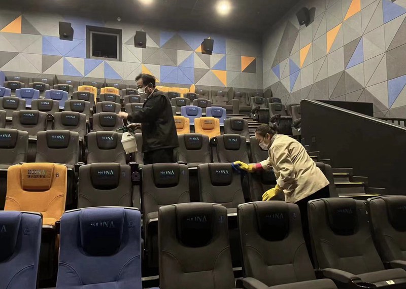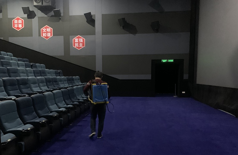 電影院的工作人員正在對影廳進行消殺。受訪者供圖