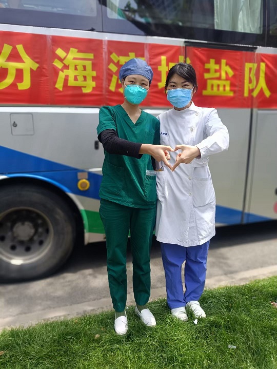 梁慧和姜蕾蕾一樣,在江蘇省鹽城市濱??h第一人民醫(yī)院腦外科任職護士。作為一名擁有8年黨齡的老黨員,在得知上海需要支援時,她毫不猶豫地在單位報名加入了江蘇省援滬醫(yī)療隊鹽城濱海分隊?!拔抑辣砻靡言谝痪€日夜奮戰(zhàn)了一個多月了,這一次,我們姐妹倆也算是一起并肩作戰(zhàn)了”,梁慧笑著說道。