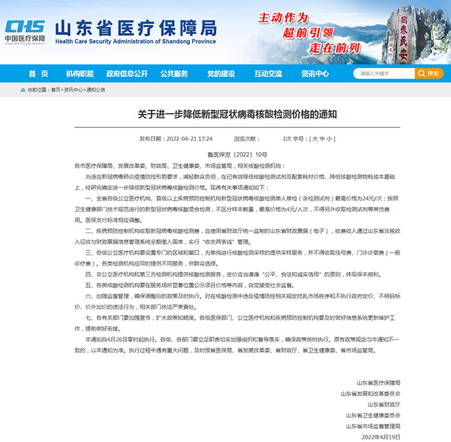 人民網(wǎng)濟南4月22日電(聶俊穹)21日,山東省醫(yī)保局、省發(fā)改委、省財政廳、省衛(wèi)生健康委、省市場監(jiān)管局等五部門聯(lián)合印發(fā)文件,自2022年4月26日零時起,進一步降低新型冠狀病毒核酸檢測價格。