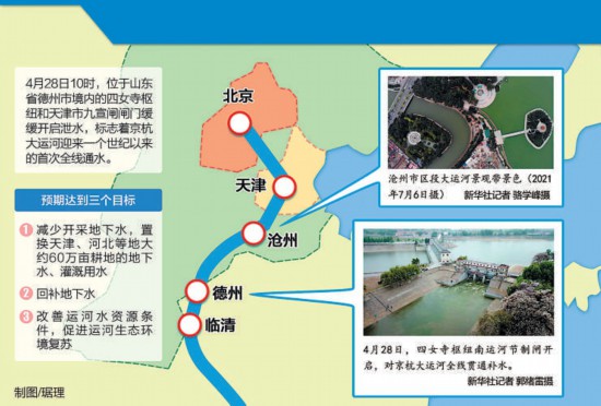 為了保護和利用好大運河,日前水利部啟動了京津冀魯京杭大運河2022年全線貫通補水行動,通過優(yōu)化調(diào)度南水北調(diào)水、黃河水、本地水、再生水及雨洪水等多水源,向京杭大運河黃河以北707公里河段進行補水,為實現(xiàn)“十四五”大運河主要河段基本有水、進一步推動實現(xiàn)京杭大運河全年有水積累經(jīng)驗。