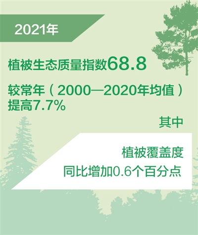 監(jiān)測結(jié)果表明,2021年植被生態(tài)質(zhì)量指數(shù)為68.8,較常年(2000—2020年均值)提高7.7%。與2020年相比,2021年植被生態(tài)質(zhì)量指數(shù)提高0.4%,其中植被覆蓋度增加0.6個百分點,植被凈初級生產(chǎn)力增加0.7克碳/平方米。