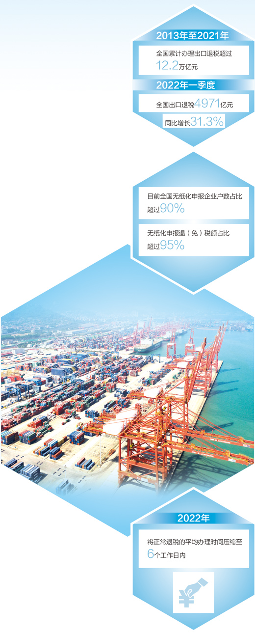 資金是企業(yè)的生命線。為助力外貿(mào)企業(yè)發(fā)展,財(cái)稅部門落實(shí)出口退稅政策,持續(xù)優(yōu)化出口退稅管理。2020年國(guó)家提高1464項(xiàng)產(chǎn)品的出口退稅率,稅務(wù)部門加強(qiáng)宣傳輔導(dǎo)、精準(zhǔn)推送,截至2021年底,共有9.4萬(wàn)戶企業(yè)因這項(xiàng)政策受益,累計(jì)新增退稅377億元,進(jìn)一步增強(qiáng)了競(jìng)爭(zhēng)力和抗壓力。2021年,國(guó)家稅務(wù)總局以出口退稅信息系統(tǒng)整合優(yōu)化為契機(jī),大幅簡(jiǎn)并優(yōu)化退稅申報(bào)表單資料及辦稅流程,使出口退稅管理體系業(yè)務(wù)更全面、流程更優(yōu)化、權(quán)責(zé)更清晰、運(yùn)行更高效。