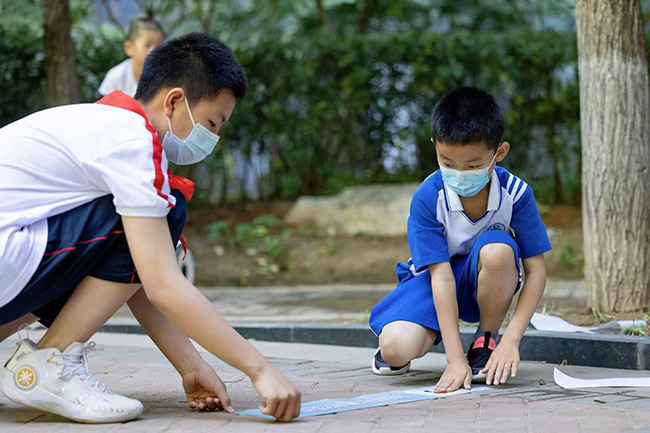 陶然亭街道大吉巷社區(qū)的一處核酸點位上,兩米線安全提示標識引起大伙兒注意?!氨苊饩奂?,嚴防疫情”“綠色出行,愛心助考”“文明陪考,安全第一”……誰能想到這些醒目的標語竟然是“陶然娃”們想的“愛心助考公約”。“馬上就是高考了,希望哥哥姐姐們能取得好成績,不辜負自己多年的努力?!?3歲的陳博一趴在地上,奮力的拍了拍自己剛剛貼好的“公約宣傳條”。