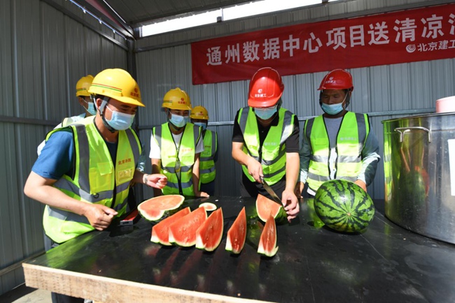 在通州數(shù)據(jù)中心項目頂板鋪設(shè)施工現(xiàn)場,高溫對奮戰(zhàn)在施工一線的員工來說無疑是一場巨大的“烤驗”?!半m然現(xiàn)場的溫度達到了38℃,但是項目部合理調(diào)配時間,對現(xiàn)場的防暑降溫工作做了全面部署,施工現(xiàn)場配備了西瓜、綠豆湯、藿香正氣水和清涼油等防暑物資,在場邊設(shè)置了遮陽涼棚,并且讓施工人員避開上10點到下午3點的高溫期錯時上崗,保證現(xiàn)場安全生產(chǎn)的同時也盡量不耽誤項目進度?!表椖坎控撠熑撕乐艺f。