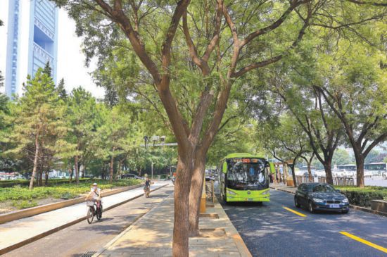 此外,在獨立的公交站臺外側,利用原有綠地,新建非機動車道和人行步道各一條,均為2.5米寬。自行車道采取外繞公交站臺方式,保障騎行路線安全、連續(xù)?!艾F(xiàn)在,從國貿橋到大望橋,自行車可以連續(xù)騎行,不再受公交車進站影響。”殷浩介紹,該工程于今年4月進場施工,目前已完工。
