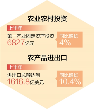 農(nóng)業(yè)農(nóng)村投資穩(wěn)步增長(zhǎng),農(nóng)村消費(fèi)市場(chǎng)逐步恢復(fù)。農(nóng)業(yè)農(nóng)村投資渠道拓寬。落細(xì)落實(shí)扎實(shí)穩(wěn)住經(jīng)濟(jì)一攬子政策措施,全力推動(dòng)重大政策落地實(shí)施和重大工程項(xiàng)目開工建設(shè)。上半年,第一產(chǎn)業(yè)固定資產(chǎn)投資6827億元,同比增長(zhǎng)4%。鄉(xiāng)村消費(fèi)持續(xù)恢復(fù)。鄉(xiāng)村消費(fèi)品零售額2.77萬(wàn)億元,與去年基本持平,恢復(fù)到2019年的98%。農(nóng)產(chǎn)品進(jìn)出口保持增長(zhǎng)勢(shì)頭,進(jìn)出口總額達(dá)到1616.8億美元,同比增長(zhǎng)10.4%。