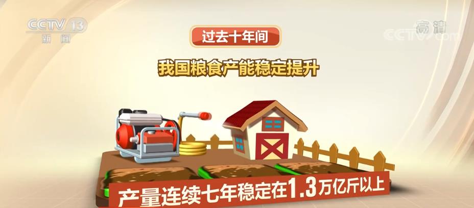 過去十年間,我國糧食產(chǎn)能穩(wěn)定提升,產(chǎn)量連續(xù)七年穩(wěn)定在1.3萬億斤以上,十年再上一個(gè)千億斤新臺(tái)階。人均糧食產(chǎn)量達(dá)到483.5公斤,高于國際公認(rèn)的400公斤糧食安全線,做到了谷物基本自給、口糧絕對安全。