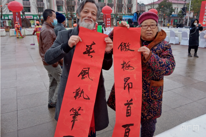 在書法展位,藝術(shù)家們也忙碌著,現(xiàn)場書寫春聯(lián)送給當(dāng)?shù)鼐用?。寒冷的天氣沒有阻擋藝術(shù)家們創(chuàng)作的熱情,他們鋪開紙、備好墨、拿起筆,將心底的祝福落于紙上。玉龍鎮(zhèn)居民李昌蘭拿著剛得到的“春風(fēng)執(zhí)筆一枝翠,傲梅昂首百花最”春聯(lián)笑得合不攏嘴:“我回去就把這副春聯(lián)貼在門前!”(陳發(fā)源 徐云卿)
