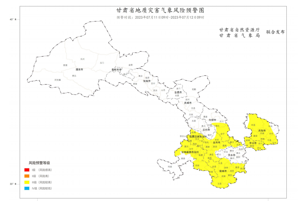 甘肅省自然資源廳、甘肅省氣象局于7月11日9時聯(lián)合發(fā)布地質災害氣象風險預警:預計未來24小時內,白銀市靖遠縣、平川區(qū)、白銀區(qū)、會寧縣,定西市安定區(qū)、臨洮縣、通渭縣、渭源縣、隴西縣、漳縣、岷縣,甘南藏族自治州夏河縣、合作市、卓尼縣、臨潭縣、迭部縣、舟曲縣,臨夏回族自治州永靖縣、積石山保安族東鄉(xiāng)族撒拉族自治縣、東鄉(xiāng)族自治縣、臨夏縣、和政縣、廣河縣、康樂縣,隴南市禮縣、宕昌縣、兩當縣、西和縣、徽縣、成縣、武都區(qū)、康縣、文縣,平涼市靜寧縣、崆峒區(qū)、涇川縣、莊浪縣、華亭市、崇信縣、靈臺縣,慶陽市環(huán)縣、華池縣、合水縣、鎮(zhèn)原縣、慶城縣、寧縣、西峰區(qū)、正寧縣因氣象因素致地質災害發(fā)生的風險較高(黃色預警),部分地區(qū)預計6小時內降雨量將達50毫米以上,已達50毫米以上的地區(qū)降雨可能持續(xù)。其中甘南州夏河縣累積雨量可達50毫米以上,隴南市文縣最大小時雨強可達30毫米以上。