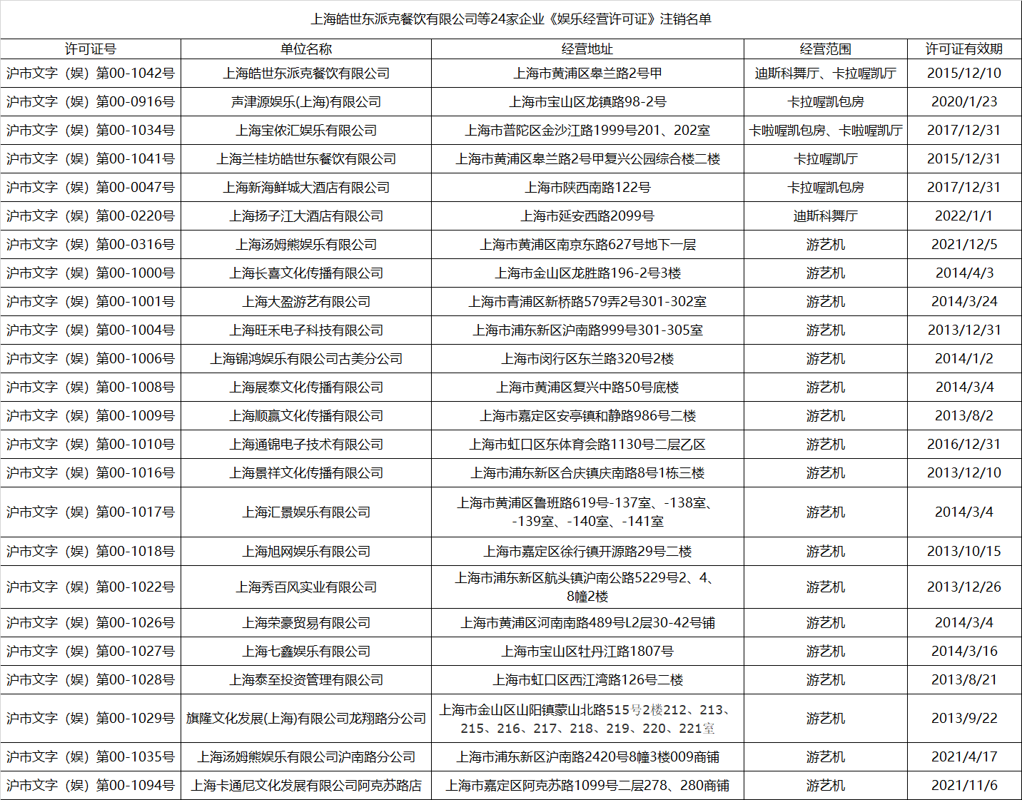 上海市24家企業(yè)被注銷《娛樂經(jīng)營(yíng)許可證》