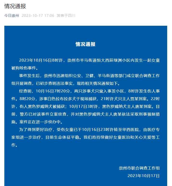 剛剛,“今日崇州”微信公號(hào)發(fā)布通報(bào):16日8時(shí)20分,涉事白色拉布拉多犬于現(xiàn)場(chǎng)捕獲,21時(shí)許犬只主人賈某到案。22時(shí)許,傷人黑色羅威納犬被捕獲;10月17日3時(shí)許,黑色羅威納犬主人唐某到案。目前,警方已對(duì)該事件立案?jìng)刹?,并?duì)黑色羅威納犬主人唐某依法采取刑事強(qiáng)制措施。案件正在進(jìn)一步偵辦中。