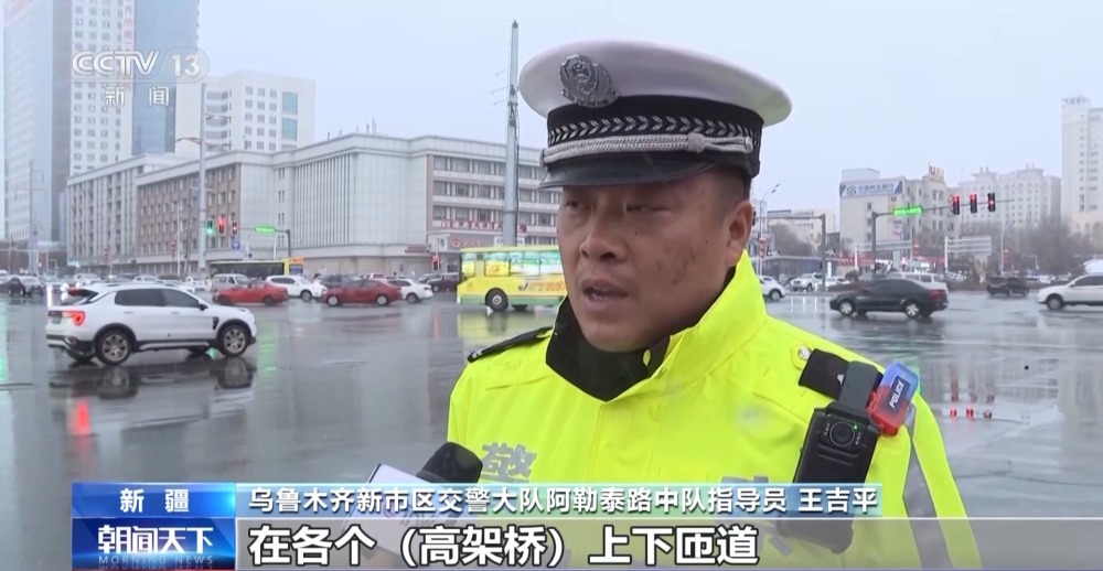 烏魯木齊新市區(qū)交警大隊阿勒泰路中隊指導(dǎo)員 王吉平:交警部門前期在各個高架橋上下匝道以及坡道的地方,存放了防滑物資,應(yīng)對下雪以后可能造成道路結(jié)冰打滑的情況,保障道路暢通。