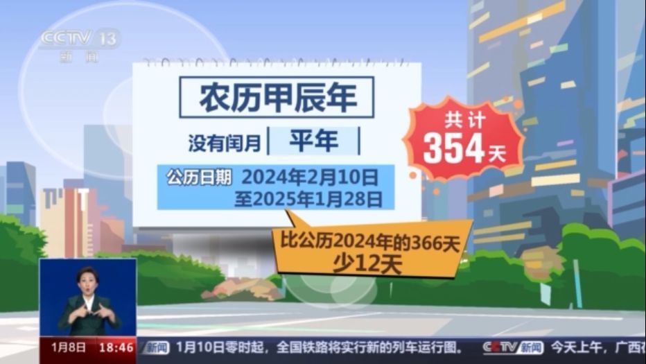 即將到來的農(nóng)歷甲辰年沒有閏月,因此是一個平年,其對應(yīng)的公歷日期為2024年2月10日至2025年1月28日,共計(jì)354天。所以比公歷2024年的366天少了12天。
