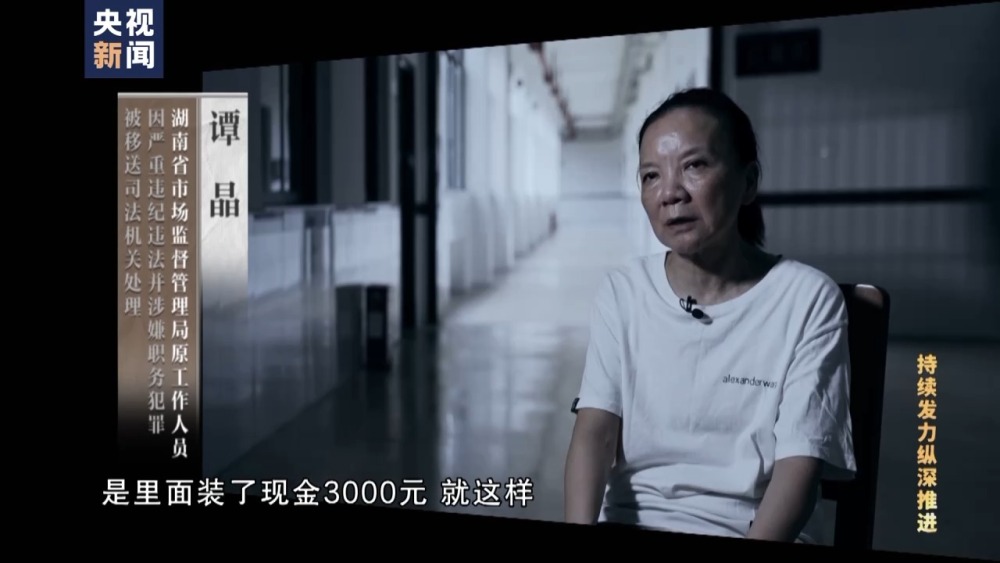 湖南省市場(chǎng)監(jiān)督管理局原工作人員 譚晶:他就拿了一個(gè)信封,在沒(méi)人的地方他就悄悄塞給我,他說(shuō)是我們單位的資料。然后我回去以后發(fā)現(xiàn)是里面裝了現(xiàn)金3000元,就這樣。所以我不逃避我自己的(責(zé)任),犯了法要承擔(dān)法律的責(zé)任,一定要。
