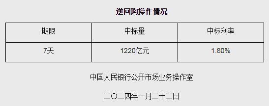 中新網(wǎng)1月22日電 據(jù)央行網(wǎng)站消息,為維護(hù)銀行體系流動性合理充裕,2024年1月22日人民銀行以利率招標(biāo)方式開展了1220億元逆回購操作,中標(biāo)利率1.80%,期限為7天。具體情況如下: