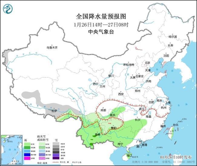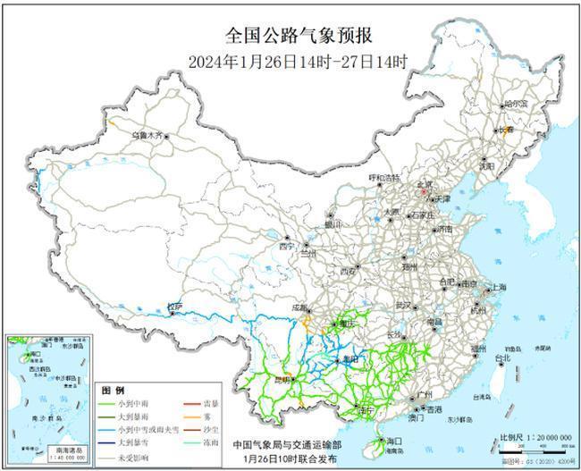預(yù)計1月26日14時至27日14時,西藏南部、四川南部、貴州中北部、云南東北部等地部分道路受小到中雪或雨夾雪影響;重慶、云南、貴州南部、廣西、湖南中南部、江西中部等地部分道路受小到中雨影響;貴州西部等地部分道路受凍雨影響。另外,吉林中部、四川中東部、云南中部、新疆西北部等地局部道路受霧影響能見度低。