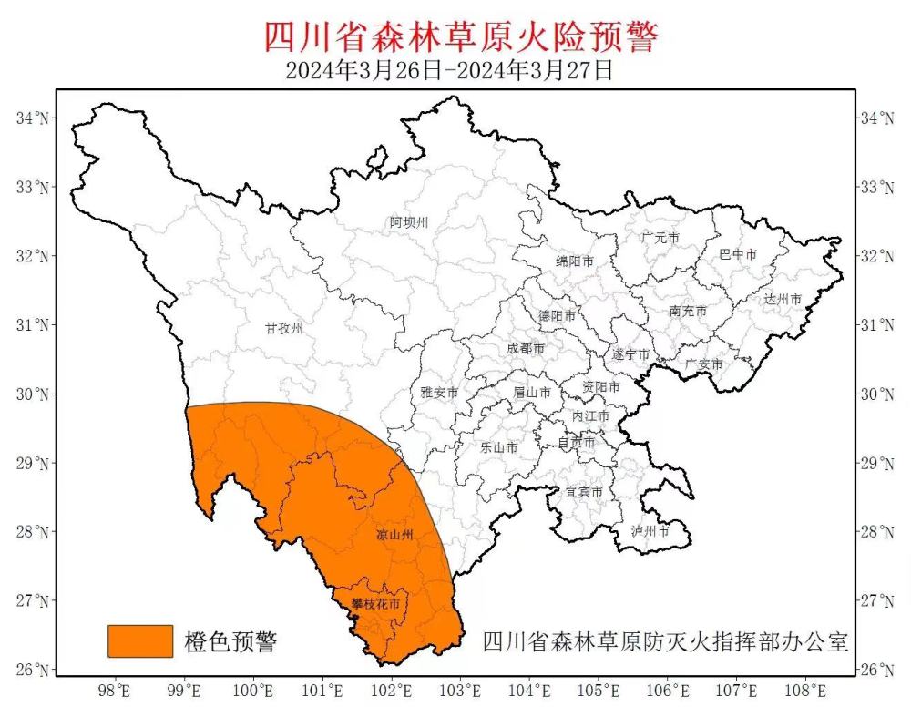 經(jīng)四川省森防指辦公室與四川省林草局、四川氣象局及相關(guān)地區(qū)會(huì)商,預(yù)計(jì)3月26日至27日攀枝花市,甘孜州東部局地和南部,涼山州西部、中部和南部(涉及21個(gè)縣級(jí)行政單位)森林草原火險(xiǎn)等級(jí)將維持在高度危險(xiǎn)級(jí)別。經(jīng)研究,延長省森防指辦公室3月21日發(fā)布的高森林草原火險(xiǎn)橙色預(yù)警至3月27日,預(yù)警范圍不變。