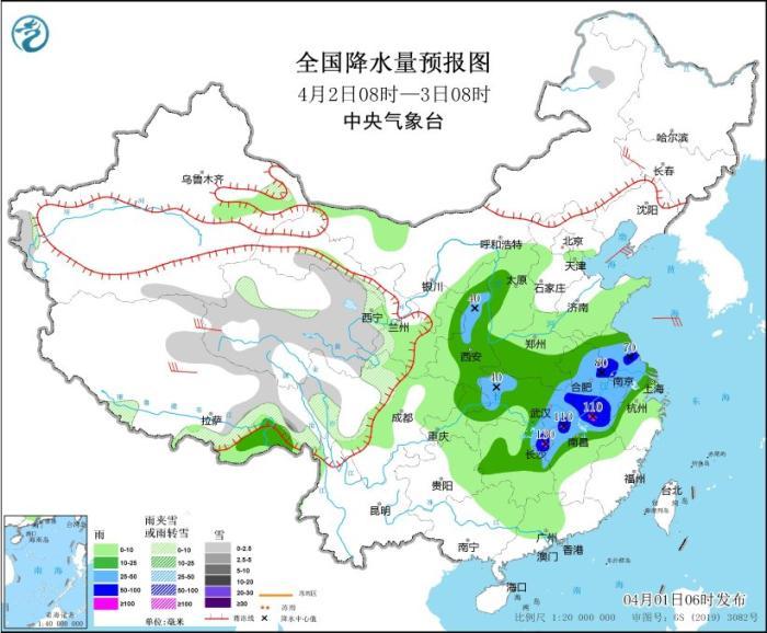 4月2日08時(shí)至3日08時(shí),青海中南部和東部、西藏東部和南部等地部分地區(qū)有小雪或雨夾雪。陜西大部、山西西部、河南中南部、安徽大部、江蘇大部、上海、重慶東北部、湖北大部、湖南中東部、江西西部和北部、浙江西北部等地部分地區(qū)有中到大雨,其中,安徽南部、江蘇中部、湖北東部、湖南東北部、江西北部等地部分地區(qū)有暴雨,局地大暴雨(100~130毫米)。吉林西部、西藏北部、青海西部等地部分地區(qū)有4~6級風(fēng)。