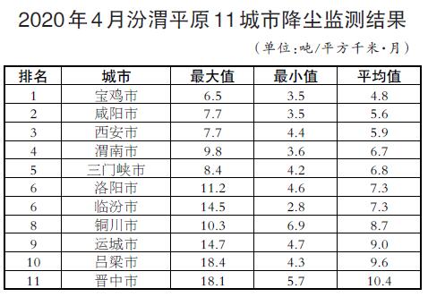 4月,汾渭平原11城市降塵量均值范圍在4.8-10.4噸/平方千米·月之間,平均為7.4噸/平方千米·月。寶雞、咸陽(yáng)、西安、渭南、三門峽、洛陽(yáng)、臨汾、銅川和運(yùn)城市等9個(gè)城市降塵量平均值小于或等于9.0噸/平方千米·月;呂梁和晉中市2個(gè)城市降塵量平均值大于9.0噸/平方千米·月,其中晉中市降塵量平均值最大,達(dá)10.4噸/平方千米·月。渭南、銅川、洛陽(yáng)、臨汾、運(yùn)城、晉中和呂梁市等7個(gè)城市降塵量最大值大于9.0噸/平方千米·月。