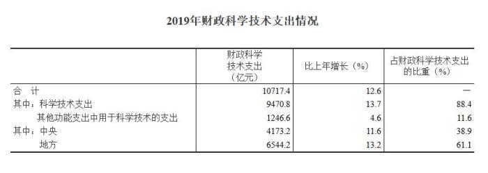 2019年,國家財政科學技術支出10717.4億元,比上年增加1199.2億元,增長12.6%。其中,中央財政科學技術支出4173.2億元,增長11.6%,占財政科學技術支出的比重為38.9%;地方財政科學技術支出6544.2億元,增長13.2%,占比為61.1%。