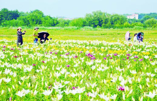 5月27日,江華瑤族自治縣沱江鎮(zhèn)天橋村生態(tài)農(nóng)業(yè)綜合產(chǎn)業(yè)園,游客在賞花、拍照。該產(chǎn)業(yè)園種植的百合既可觀賞又可食用,面積達100余畝,每畝產(chǎn)值可達3萬元以上?;ê恿水?shù)氐穆糜危龠M了村民增收致富。(黎實 趙媛媛 攝影報道)