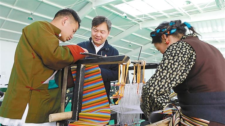 謝通門縣珠峰牛羊示范合作社內工人正在編織氆氌。
