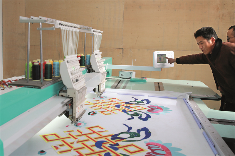 洛隆縣博織利民服飾有限公司總經(jīng)理向巴在操作電子刺繡機(jī)刺繡帳篷上的花紋圖案。陳衛(wèi)國(guó) 攝