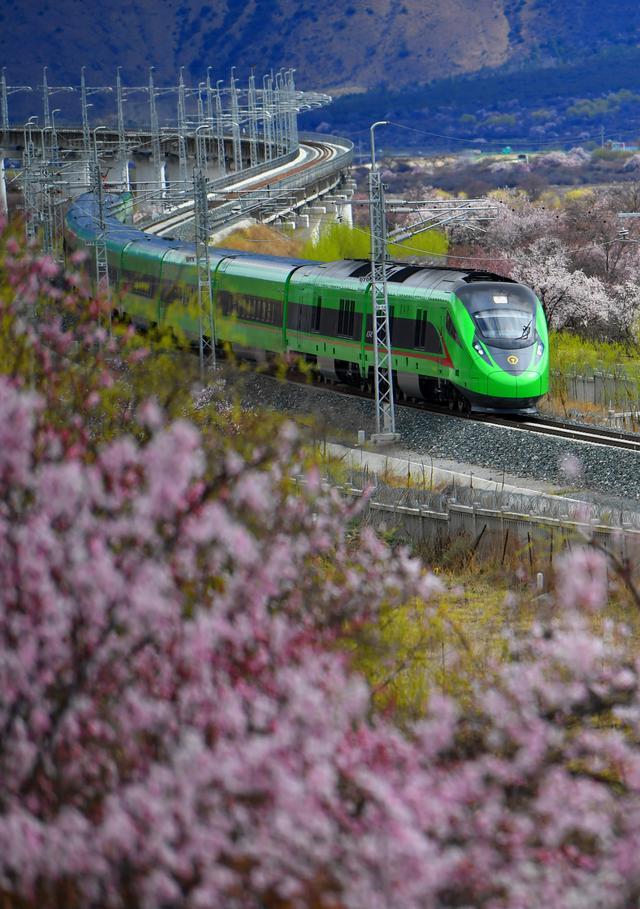 2023年3月21日,復興號列車穿行在西藏拉林鐵路林芝段的桃花間。新華社記者 覺果 攝
