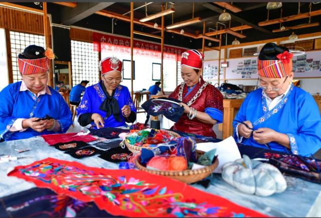 貴州省級非遺苗繡代表性傳承人龍祿穎創(chuàng)辦了非遺文化企業(yè),帶領各族群眾就業(yè)增收。圖為龍祿穎(右二)和公司員工們在手工刺繡車間刺繡。新華社記者 楊文斌 攝