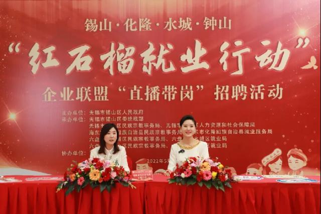 江蘇深入實施“紅石榴”就業(yè)行動。截至今年7月,全省13個設區(qū)市的410家企業(yè)累計面向民族地區(qū)各族群眾提供3.45萬個就業(yè)崗位。圖為江蘇省無錫市錫山區(qū)與貴州省六盤水市水城區(qū)、鐘山區(qū),青海省海東市化隆回族自治縣通過網(wǎng)絡平臺舉行“紅石榴就業(yè)行動”合作簽約暨企業(yè)聯(lián)盟“直播帶崗”招聘活動。江蘇省民族宗教事務委員會供圖