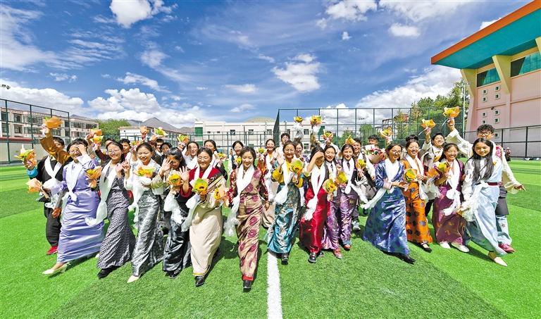 6月4日下午,拉薩中學(xué)的高三學(xué)生們在校園內(nèi)盛裝慶祝畢業(yè)。記者 唐斌 攝