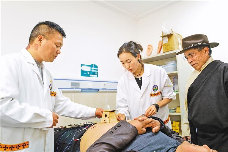 圖為在昌都市察雅縣藏醫(yī)院,重慶市大足區(qū)人民醫(yī)院援藏醫(yī)生(左)與藏醫(yī)院醫(yī)生結(jié)合中醫(yī)與藏醫(yī)療法,為患者進(jìn)行診治。記者 丹增群培 攝