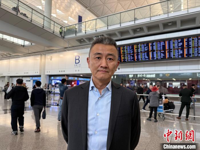 2月19日,西藏航空“拉薩-成都天府-香港”航線開通。圖為西藏航空副總經(jīng)理張兵兵在香港國際機(jī)場抵港大堂接受中新社記者采訪。 中新社記者 韓星童 攝