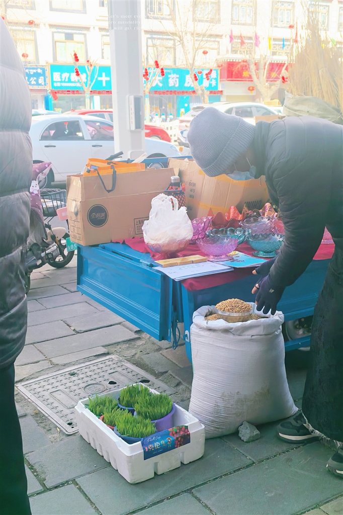 前來采購的格桑卓嘎阿姨,手里提著大包小包,臉上滿是笑意。她買了青稞酒、酥油、風干肉還有青稞苗。新年時,用青稞酒祈福,酥油茶招待客人,風干牛肉和新鮮軟糯的拉拉、用酥油雕出精美圖案的“推”一起擺盤,供客人隨時食用。“今年‘古突’和‘朗嘎’是同一天,打算全家圍坐一起吃。家里布置都按習俗,擺好切瑪、德卡、青稞苗,再給門窗換上新的‘香布’。孩子們買了不少藏文對聯(lián),說是要貼門上,祈福來年順遂。帶孩子來傳統(tǒng)市集,就是要讓他們記住咱們藏歷新年的習俗。這些年,市集多了些漂亮的藏式手工藝品,不過最有年味兒的,還得是這糌粑和青稞粒的香?!?/p>