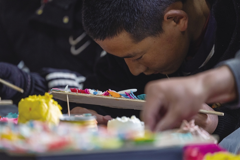 記者看到,捏酥油花的主要工序十分復雜。藝人們先制作盾形木板作為酥油花的“骨架”,支撐著整個作品的形態(tài)。當天,在幾十平方米的出租屋內,大家圍坐在墻邊,面前擺放著調制好的各色酥油和一盆盆清水。藝人們盤腿而坐,進入“敷塑”階段:他們在加工成膏狀的乳白色酥油中揉進各色礦物質顏料,調和成五顏六色的油塑原料,接著熟練地捏取酥油在冷水中浸泡,然后用指尖不斷揉捻、塑形,不時還用小木刀進行精細加工。隨后,在做好的酥油花上微灑清水,使其更加堅固且璀璨奪目。在他們的巧手下,一塊塊酥油很快就變成了日月、花瓣以及猴、象、兔、鳥等各種形狀。為了防止酥油融化,他們不停地將手放入冰水中降溫。