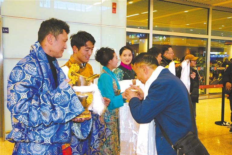 這個(gè)舉動(dòng),讓來自云南、廣東、安徽等地的100多名游客切身體驗(yàn)了一番別具西藏特色的歡迎儀式?!皼]想到一下飛機(jī)就感受到了藏族同胞們的熱情,身體的疲憊感瞬間消散了?!睆V東游客彭帆開心地說道。