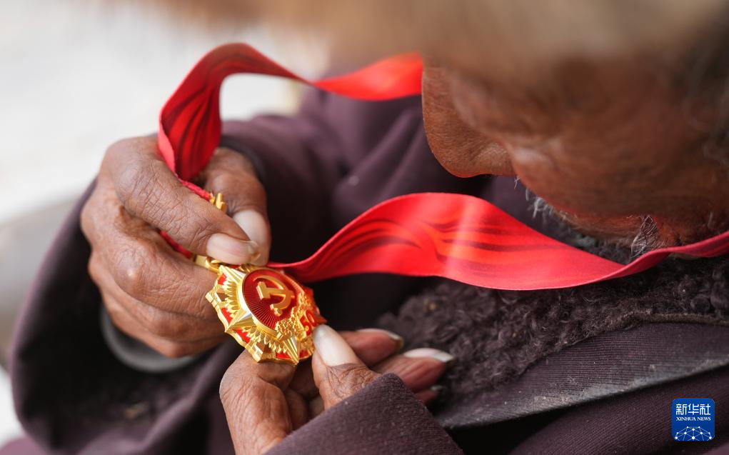 索扎老人端詳“光榮在黨50年”紀(jì)念章(3月20日攝)。新華社記者 晉美多吉 攝