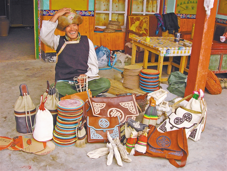 手藝人展示縣級(jí)非物質(zhì)文化遺產(chǎn)俊巴皮雕作品 。