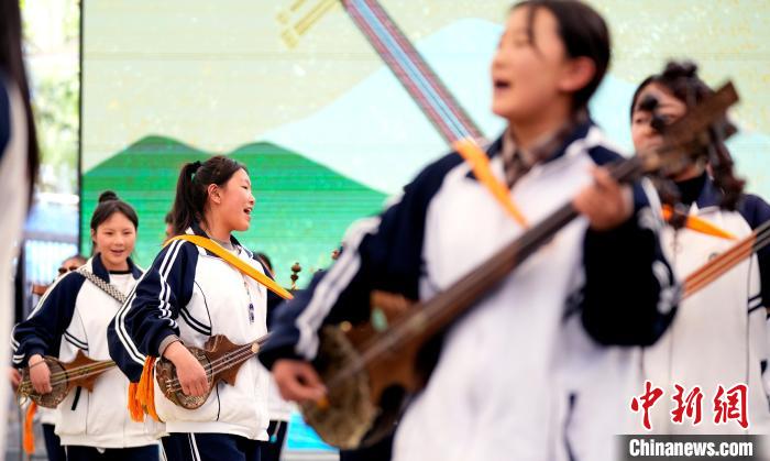 圖為4月19日,第二屆“拉薩春日書會”暨拉薩市全民閱讀推廣周系列活動開幕式上的扎念琴彈唱。李林 攝