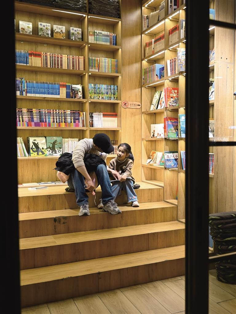 央喜書(shū)吧閱讀區(qū),讀者帶孩子一起看書(shū)。圖/記者 秦盼